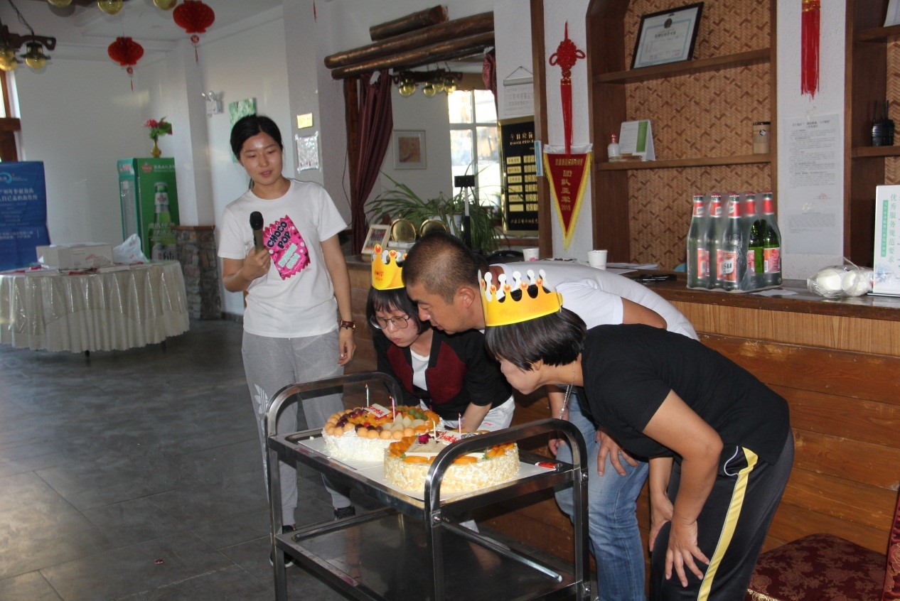 晚上的聚餐上我們為公司三名當月生日的員工進行慶祝。