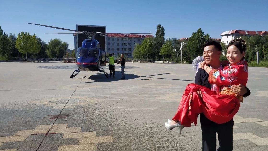 清晨,西亞航空機(jī)組在可克達(dá)拉草原驛站做航前準(zhǔn)備及檢查,隨后,迎來了新人準(zhǔn)備登機(jī),天作之合,喜從天降,在六十二團(tuán)廣場,從直升機(jī)上走下來的這對新人,吸引著老百姓驚訝與羨慕的目光,熱鬧的人群等待著新人傾心甜蜜的擁抱。在現(xiàn)場,大家紛紛拿起手機(jī)記錄下這一時(shí)刻。來自四師62團(tuán)的張美華(化名)表示,她是頭一次看到直升機(jī)接親,讓人很羨慕,希望自己也能用這種方式出嫁。