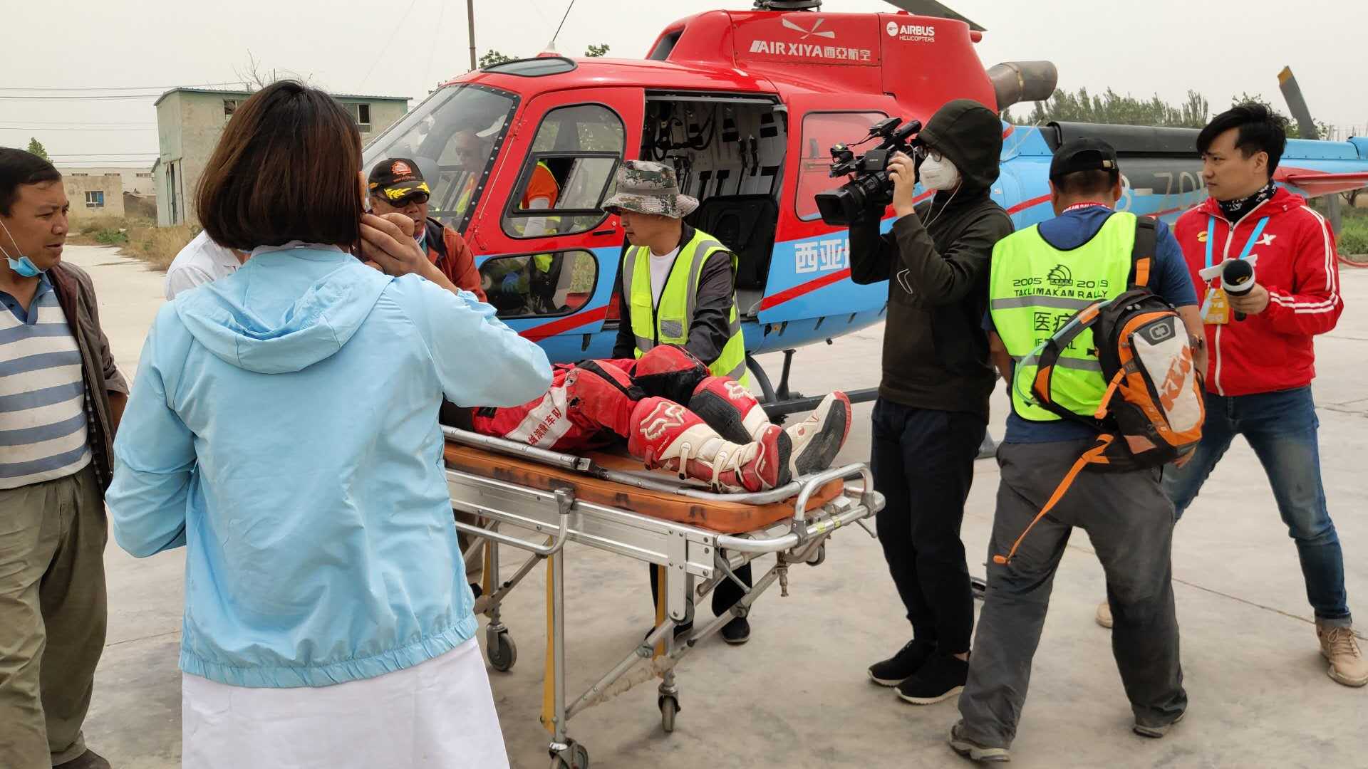 因為該賽段的特殊性及天氣狀況的原因,有兩位車手和領航不慎高速撞入深沙坑,導致受傷,待命中的西亞航空接到救援任務后立即啟動緊急救援方案,并協同地面救援人員和醫護人員組成救援團隊迅速展開救援工作,按照接收到的GPS坐標點接送傷員。救援完成后在地面工作人員的指揮下將直升機安全降落在救護車旁,由救護車送往醫院。經醫院檢查后確認,車手陳峰為腰2椎體壓縮性骨折,其領航王毅成為腰4椎壓縮性骨折,兩人均需要住院接受手術治療。車手張國宇及其領航鐘世新被診斷為腰椎骨折,同樣將無法繼續參加本屆環塔余下的比賽。